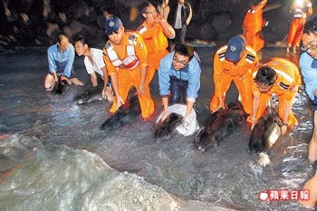 高雄縣茄萣鄉(xiāng)興達(dá)港沙灘有21只小虎鯨擱淺,海巡人員出動(dòng)大批人力搶救。
