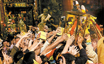 中國臺灣網(wǎng)4月27日消息 綜合臺灣媒體報道,臺灣臺中縣大甲鎮(zhèn)瀾宮媽祖340余公里繞境活動前日結束,據(jù)鎮(zhèn)瀾宮估計,今年參與繞境人數(shù)約120萬、香油錢約2400萬元(新臺幣 下同),金牌數(shù)更是達到1400多面,創(chuàng)下新高。
