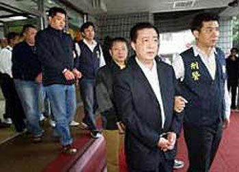 臺北市警方逮捕黑幫“天道盟太陽會特攻隊”隊長凌志成(前排右二)等9名嫌犯。 圖片來源:臺灣《中國時報》