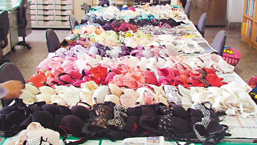 臺中縣警方在桌上整理周姓男子偷來的女性內(nèi)衣,讓民眾誤以為是母親節(jié)內(nèi)衣特賣會。 來源:臺灣《聯(lián)合報(bào)》