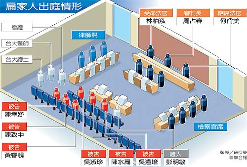 合議庭昨天傳訊“二次金改弊案”21名被告出庭,包括陳水扁、吳淑珍、陳致中、黃睿靚、陳幸妤、以及臺(tái)灣金控業(yè)者國泰蔡鎮(zhèn)宇、元大馬志玲、馬維建、馬維辰父子、中信辜仲諒等人全部到庭,加上律師團(tuán)成員,幾乎擠爆整個(gè)法庭。
