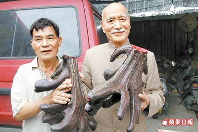 中國臺灣網(wǎng)5月15日消息 據(jù)臺灣《蘋果日報》報道,南投縣水里鄉(xiāng)一只3歲臺灣水鹿,今年長出大鹿茸昨采割,磅秤結(jié)果重218.7兩。臺灣養(yǎng)鹿協(xié)會理事長鄭肇信說,這是今年第二剪(指一只鹿第二年采割)鹿茸全臺最大的,以市價1兩千元計,價值近22萬元新臺幣。買主是以模仿蔣介石聞名的李登科(圖右),他說要買來泡藥酒補身子用。(中國臺灣網(wǎng) 高大林)
