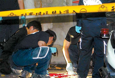 警員莊志強(qiáng)在停車場開槍誤傷派出所長后自殺,留下大片血跡,鑒識人員到場采證。來源:臺灣《蘋果日報(bào)》
