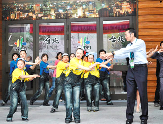 臺灣喜樂家族的唐寶寶、喜憨兒昨天在世博臺北館表演打擊樂與舞蹈,館長陳慶安(前右)加入共舞。(圖片來源:臺灣《聯(lián)合報》)
