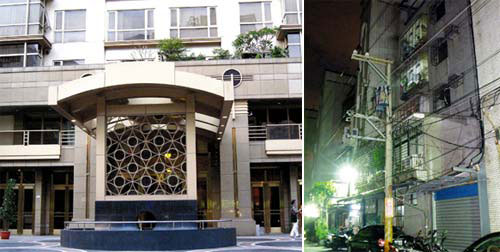 “富家男”溫建和住在臺(tái)北市的百達(dá)富麗豪宅(左圖),自稱身價(jià)數(shù)億元,他的會(huì)計(jì)女友梁玉姍月薪四萬(wàn)元,住在臺(tái)北縣三重市一棟舊公寓(右圖),卻侵占公款供他花用。 圖片來(lái)源:臺(tái)灣《聯(lián)合報(bào)》