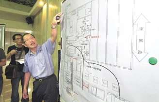 警方公布黑道角頭槍擊案相關錄像畫面,圖為臺中市第一分局刑警隊隊長楊春賢說明命案發(fā)生時,四名官警在場位置與歹徒槍殺時相關示意圖。圖片來源:聯(lián)合報