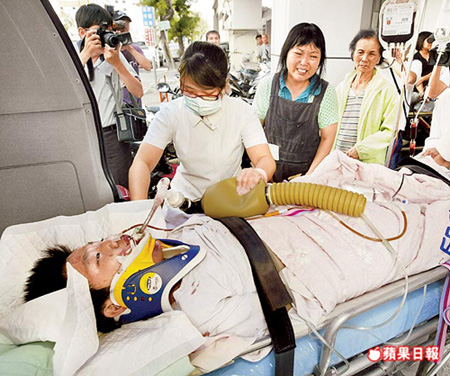 在場(chǎng)學(xué)生嚇得報(bào)告老師和學(xué)校護(hù)士,張童不斷哀叫:“全身好痛!”口吐鮮血送醫(yī)急救。張童在臺(tái)灣造船公司上班的父親和開設(shè)面館的母親聞?dòng)嵹s到醫(yī)院,張母不斷哭喊:“你要加油”、“媽媽心好痛,你怎么摔成這樣?”醫(yī)院診斷張童腦部輕微出血、氣胸、左肺挫傷、肺積水等現(xiàn)象,轉(zhuǎn)送高雄醫(yī)學(xué)大學(xué)附設(shè)醫(yī)院手術(shù)急救,有生命危險(xiǎn)。