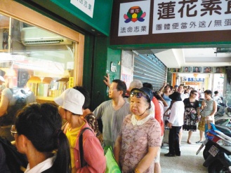 永和市蓮花素食館因神秘男子捐出48萬元,連續(xù)八周的周日免費提供素食,11日首日排隊人龍綿延100多米。 圖片來源:臺灣《聯(lián)合報》