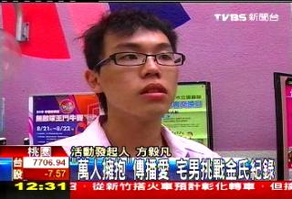 帶著粗框眼鏡、穿著襯衫的方毅凡,今年25歲,桃園人,從沒談過戀愛,生活里只有計算機,很少和人來往,是外人眼中的網(wǎng)絡(luò)宅男,這次發(fā)起“萬人擁抱”的活動,要在7月24日那天,在中壢龍崗大操場,挑戰(zhàn)吉尼斯世界紀(jì)錄。
