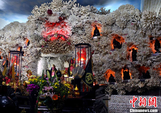 進(jìn)入7月中下旬的臺灣富福頂山寺游客大增。這座寺廟位于三芝鄉(xiāng)橫山山上,據(jù)說是一位信徒從1996年起用上百種珊瑚與六萬多種貝殼堆砌而成,故又稱貝殼廟。此廟主奉祀濟(jì)公活佛和十八羅漢與圣母娘娘。廟堂建筑特別,色彩斑斕,猶如“海底世界”,慕名而來的香客游人絡(luò)繹不絕,香火旺盛。中新社發(fā) 宋吉河 攝