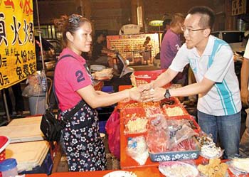身陷召妓疑云的陳致中(右),25日晚間前往高雄夜市拜票。圖片來(lái)源:臺(tái)灣《中國(guó)時(shí)報(bào)》