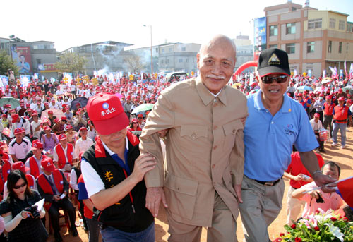酷似蔣介石的李登科,成為臺(tái)灣吸引大陸觀光客的新武器。圖為李登科(中)2009年在金門為縣長(zhǎng)參選人李沃士輔選時(shí),民眾爭(zhēng)相目睹他風(fēng)采的情形。圖片來(lái)源:“中央社”