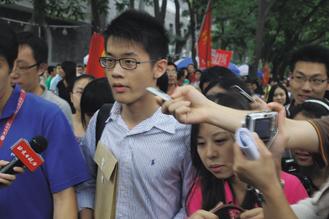 臺灣作家李敖的兒子李戡,昨天到北京大學報到,李戡走到那里,都有一大群媒體記者跟隨,也引來路邊的新生、家長關(guān)注。圖片來源:臺灣《聯(lián)合報》