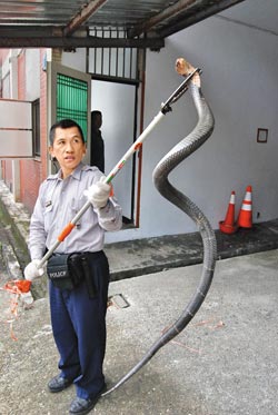 去年在臺(tái)北縣民宅庭院內(nèi)被捕獲長1.6米的眼鏡蛇。(圖:臺(tái)灣《中國時(shí)報(bào)》)