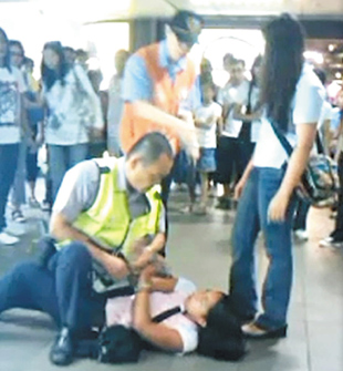 臺北市一名男警察在臺北車站查緝時,跨坐在印尼籍女子身上許久,引起大批民眾圍觀、議論紛紛。 來源:臺灣《聯(lián)合報》