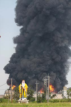 嘉義縣太保市的南亞塑料廠附近的一尊土地公身后,火海黑煙沖天。(圖:臺(tái)灣《中國(guó)時(shí)報(bào)》)