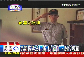 中國臺灣網(wǎng)10月9日消息 據(jù)臺灣TVBS電視臺報道,“五都”(臺北縣升格后的新北市、臺北市、縣市合并后的大臺中市、大臺南市和大高雄市)選戰(zhàn)進入倒計時階段,市議員參選人抓住最后時機,拼人氣搶選票,絞盡腦汁用盡各種辦法跟選民拉近距離。有的參選人憂慮自己知名度不夠,索性自導(dǎo)自演影片,劇本跟拍攝手法媲美偶像劇,很有質(zhì)感,借此來拉攏年輕選民;有的參選人則跟著垃圾車拜票,哪里有人就往哪里去,到人群集中的地方拉選票。