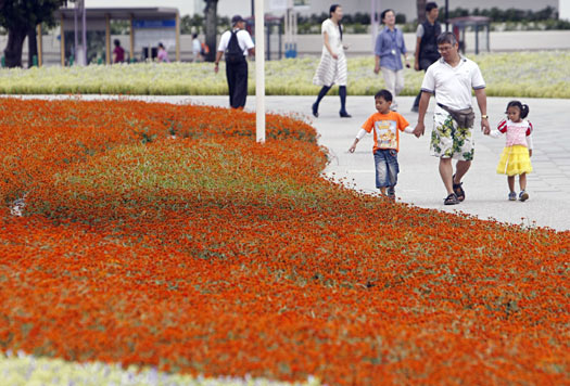 臺(tái)北花博會(huì)9日展開為期 20天、4 階段測(cè)試,開放上千名測(cè)試志工進(jìn)入圓山公園區(qū),許多民眾攜家?guī)Ь烨皝,一睹園區(qū)內(nèi)的壯觀花海。圖片來源:“中央社”
