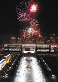 臺(tái)中市新市政中心昨晚舉行點(diǎn)燈儀式,新市政中心燈火通明與璀璨焰火互相輝映,照亮臺(tái)中市夜空。來源:臺(tái)灣《聯(lián)合報(bào)》