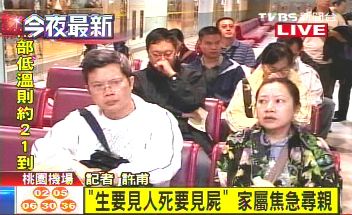家屬一下飛機,先由臺灣相關人員協(xié)助領取趕辦的入臺證件,有人神情相當哀傷,表示要見到先生一面,“生要見人、死要見尸!币灿腥搜诿婵奁,甚至難過到幾乎無法行走,家屬代表說“希望趕快找到親人!”