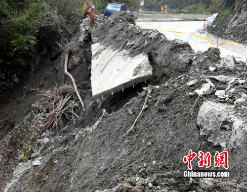 10月25日,在發(fā)現(xiàn)人體殘肢的蘇花公路112.8公里處,21日因臺(tái)風(fēng)和豪雨被泥石流沖垮的公路上,仍可看見(jiàn)被泥石流撕裂的水泥板懸掛在路邊,可見(jiàn)當(dāng)時(shí)泥石流威力之大。記者陳立宇 攝