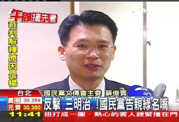 國(guó)民黨文傳會(huì)主委蘇俊賓表示,前臺(tái)灣地區(qū)領(lǐng)導(dǎo)人陳水扁判決定讞了,這時(shí)候來(lái)指控我們涉入司法,借由司法來(lái)操控選舉,我想是明顯妨礙我們名譽(yù)。(中國(guó)臺(tái)灣網(wǎng) 劉海偉)