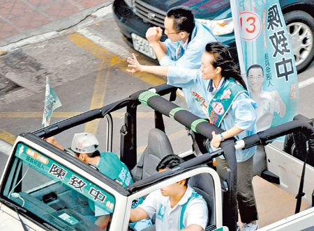 陳致中控告《壹周刊》案敗訴后,陳致中、黃睿靚夫婦昨日下午率車隊(duì)游街拜票,黃睿靚悲情催票“拉一把致中”。圖片來源:臺灣《中國時(shí)報(bào)》