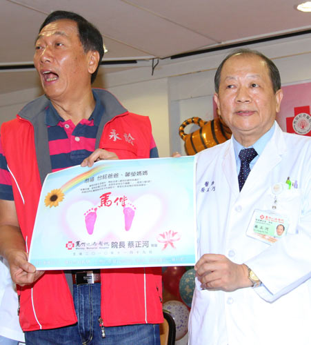 郭臺銘(左)召開記者會宣布喜事,馬偕醫(yī)院院長蔡正河(右)送上寶寶的小腳印祝賀。圖片來源:臺灣“中央社”