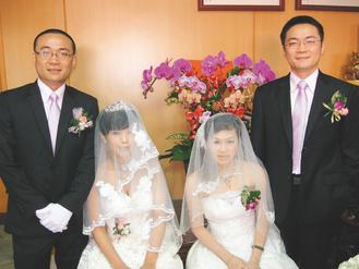 臺(tái)南縣沈威廷(左)、沈威志(右)雙胞胎兄弟同日娶妻,親友們包一個(gè)紅包喝兩對(duì)新人喜酒,紛祝兩人明年都生“雙生”。