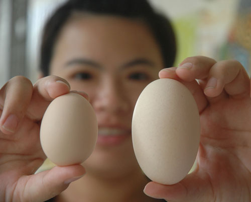 臺(tái)東市陳姓婦女養(yǎng)的土雞23日下一顆“巨蛋”,外觀乍看下,幾乎是正常雞蛋的兩倍大。臺(tái)東動(dòng)物防疫所表示,有可能是雙卵黃雞蛋。 圖片來(lái)源:“中央社”