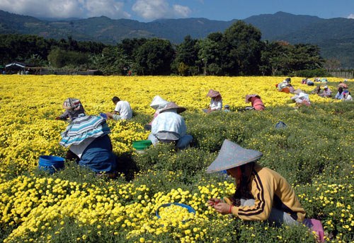 臺(tái)東杭菊進(jìn)入了采收期,但2010年因氣候變遷和部分蟲(chóng)害影響,杭菊收成量減少3成。圖為農(nóng)民25日忙著采收杭菊,田園景色美不勝收。 圖片來(lái)源:“中央社”