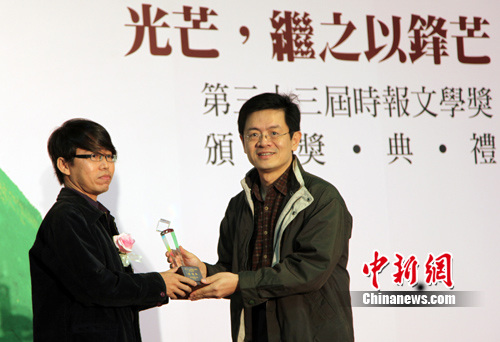 以《毒藥》一文獲得散文組首獎的楊邦尼(左)來自馬來西亞,他是一位艾滋病患者。他說:“我是書寫者,也是主人公,文中對疾病的紀實描寫,既是不容散失的記憶也是隱私,寫作時有一定困擾!抖舅帯氛f的就是‘主人公’中毒了;而‘我’用文字來解毒。所以,感謝文學!” 關(guān)向東 攝
