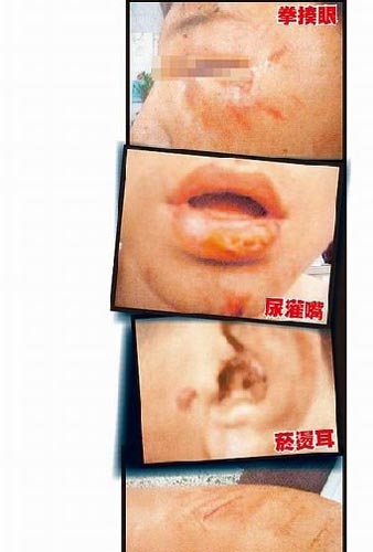高姓少年頻解釋未出賣韓男,但韓男聽不進(jìn)去,隨即與鐘姓少年(十三歲)及綽號“阿酷”的男子,以拳頭、木棍、畚箕及日光燈管、木椅不斷痛毆高姓少年,又直接撒尿在他的身上,接著還拿點(diǎn)燃的香煙燙高姓少年的耳朵、小腿,用燒燙的燭油滴在他臉上,三人還收集尿液強(qiáng)迫他喝下。高姓少年被凌虐一晚,不斷求饒認(rèn)錯,直到翌日下午才獲釋,回家時全身是傷,眼睛、嘴唇嚴(yán)重紅腫,全身有多處傷口。