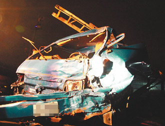 藍(lán)色貨車昨晚在新城鄉(xiāng)七星潭德燕漁場(chǎng)旁路旁,與載有10名陸客團(tuán)的游覽車對(duì)撞,車頭嚴(yán)重變形。 圖片來源:臺(tái)灣《聯(lián)合報(bào)》