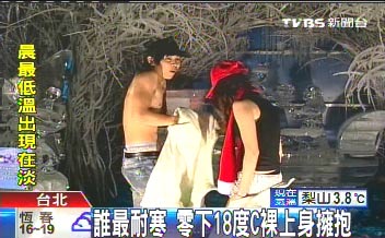 據(jù)臺灣TVBS報(bào)道,這2天臺灣天氣冷,但有情侶偏偏就愛酷寒的氣候,在極地挑戰(zhàn)擁抱最久的比賽。