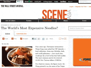 《華爾街日報》報道稱,這家面店在臺北東區(qū),店里有40個座位館,供應(yīng)著世界上最昂貴的牛肉面,一碗面的最高價竟達(dá)324美元(1萬新臺幣)。雖然該餐館也有比較便宜、只要200元新臺幣的普通牛肉面,但幾乎每一天,都會有客人點(diǎn)最昂貴的牛肉面。