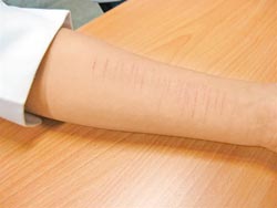 其中一位自稱失戀的男生,坦承從小學(xué)開始,心情不好時就會劃手發(fā)泄情緒。還有一名學(xué)生是在假日時,整天玩計算機被家長禁止,親子關(guān)系緊繃,結(jié)果就負(fù)氣劃手讓家長看。另有4名女生則是“搏氣魄”,彼此詢問“敢不敢?”就劃下去了!