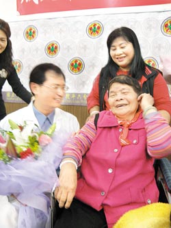 老太太兩度生命交關(guān)都是林寶彥救回,一年來兩人變得像朋友。昨日該院心導(dǎo)管室慶祝成立兩周年,老太太回院贈花給救命恩人,頻頻念著“我的命都是林醫(yī)師救回來的,謝謝啦,謝謝啦。”照顧她的三女兒陳麗如感動得掉淚。