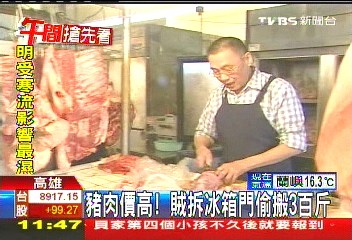 據(jù)臺(tái)灣TVBS報(bào)道,年關(guān)將近,豬肉是年菜不可或缺的重點(diǎn)食材,價(jià)格也跟著上揚(yáng),現(xiàn)在傳出市場(chǎng)的豬肉攤成了竊賊目標(biāo),高雄多個(gè)市場(chǎng)豬肉攤被竊,有的攤商甚至一個(gè)晚上被偷走300斤的豬肉。