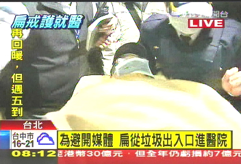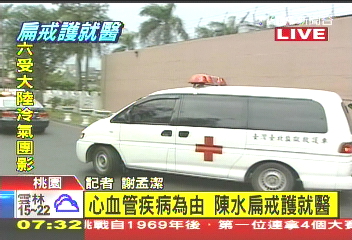 中國(guó)臺(tái)灣網(wǎng)1月19日消息 據(jù)臺(tái)灣TVBS電視臺(tái)報(bào)道,由于心血管疾病,前臺(tái)灣地區(qū)領(lǐng)導(dǎo)人陳水扁今天(19日)早上7時(shí)25分在警車(chē)戒護(hù)下從臺(tái)北監(jiān)獄前往桃園醫(yī)院就醫(yī),為了避開(kāi)媒體,臺(tái)北監(jiān)獄安排陳水扁的救護(hù)車(chē)從垃圾出入口處進(jìn)入醫(yī)院。