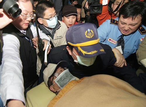 陳水扁因心臟問題,上午被送往桃園醫(yī)院戒護(hù)外醫(yī)。陳水扁躺在推床上,戴著口罩,雙眼緊閉,沒有說(shuō)任何話。