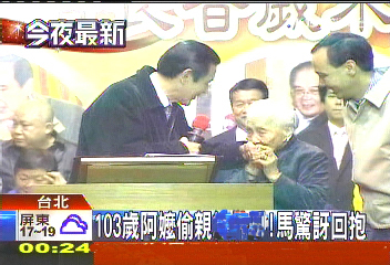 中國臺灣網(wǎng)1月23日消息 據(jù)臺灣TVBS電視臺報(bào)道,馬英九昨天(22日)傍晚和獨(dú)居老人溫馨圍爐大團(tuán)圓,親手包刈包給老人吃,還被103歲的人瑞阿嬤偷吻。馬英九驚訝之余,感動地?fù)肀О。阿嬤則說,她才是老人,在她眼中,小她40歲的馬英九就像孩子。(中國臺灣網(wǎng) 吳斌)