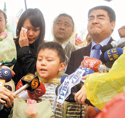陳光標(biāo)(右)上午到金山鄧麗君墓園追悼,全家高唱鄧麗君歌曲,表情哀戚。 來源:臺(tái)灣《聯(lián)合晚報(bào)》