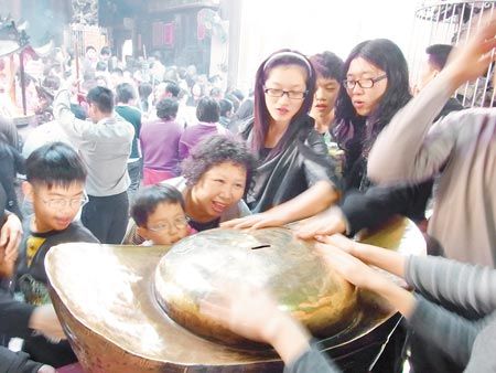 云林北港武德宮財(cái)神爺廟涌進(jìn)大批人潮,大家爭(zhēng)相撫摸鎮(zhèn)殿大元寶,希望財(cái)運(yùn)亨通。 來(lái)源:臺(tái)灣《中國(guó)時(shí)報(bào)》