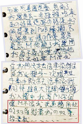 報(bào)道稱(chēng),該女子在筆記本中記載了她與美籍華裔男子的性愛(ài)過(guò)程,其中寫(xiě)到:“要不要性愛(ài)”、“內(nèi)心好快樂(lè),好希望時(shí)間停住,也決定去汽車(chē)旅館”、“進(jìn)房大張開(kāi)雙手擁我入懷,我罵M你很壞,M不讓我說(shuō),直接用他的雙唇貼著我的雙唇,接著就……”等露骨語(yǔ)句;且她還被丈夫查到寄內(nèi)衣褲給情夫的郵遞收據(jù),另外一名香港男子也坦承和沈女發(fā)生過(guò)性關(guān)系。
