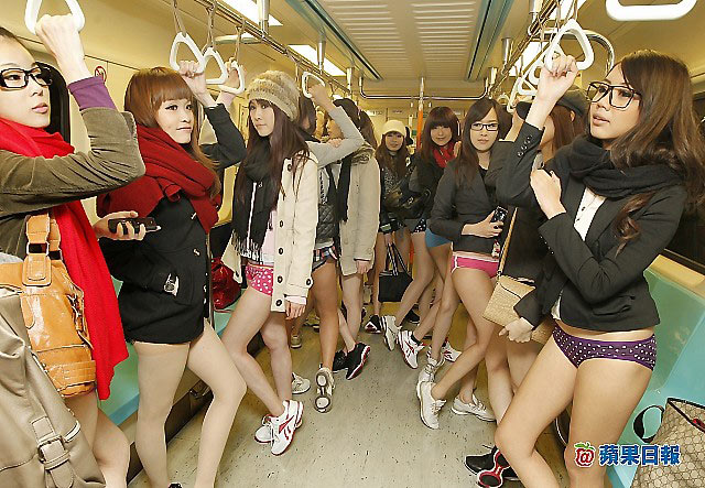 昨日為Reebok倡導(dǎo)的“無褲日”,20名正妹只穿內(nèi)褲搭乘捷運,引起了男乘客的騷動。圖片來源:臺灣媒體