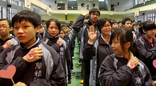臺(tái)北市蘭雅中學(xué)16日上午舉行“080零霸凌”校園反霸凌活動(dòng),師生齊聚活動(dòng)中心,舉手宣示將共同維護(hù)友善校園環(huán)境。圖片來源:臺(tái)灣“中央社”