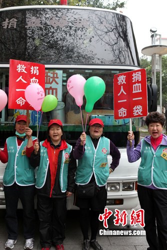 由于天氣濕冷及季節(jié)性原因,臺灣各地血庫告急,血庫缺血情形為近5、6年來最重。圖為2月17日,臺北馬偕醫(yī)院與臺北市捐血中心聯(lián)合舉辦活動,志工手持標語,高喊口號呼吁民眾踴躍捐血。 董會峰 攝