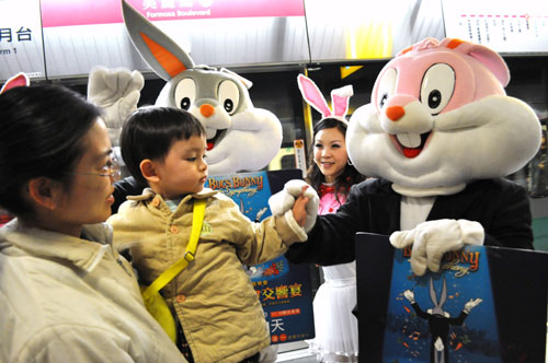 2011高雄春天藝術(shù)節(jié)“兔寶寶大鬧交響宴”草地音樂會26日將登場,經(jīng)典卡通人物兔寶寶22日搭高雄捷運(yùn)為演出造勢,受到小朋友歡迎。 圖片來源:“中央社”