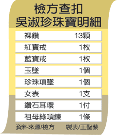 報道稱,臺特偵組于偵查中2度搜索扁家,將吳淑珍珍藏的大量珠寶扣案。這些珠寶琳瑯滿目,包括從扁家友人黃芳彥西裝口袋找到的裸鉆一共13顆、紅寶戒1只、藍(lán)寶鉆戒1只、玉墜1顆、珍珠項墜1條、女表1支、鉆石耳環(huán)1付、祖母綠項鏈1條,價格不詳。